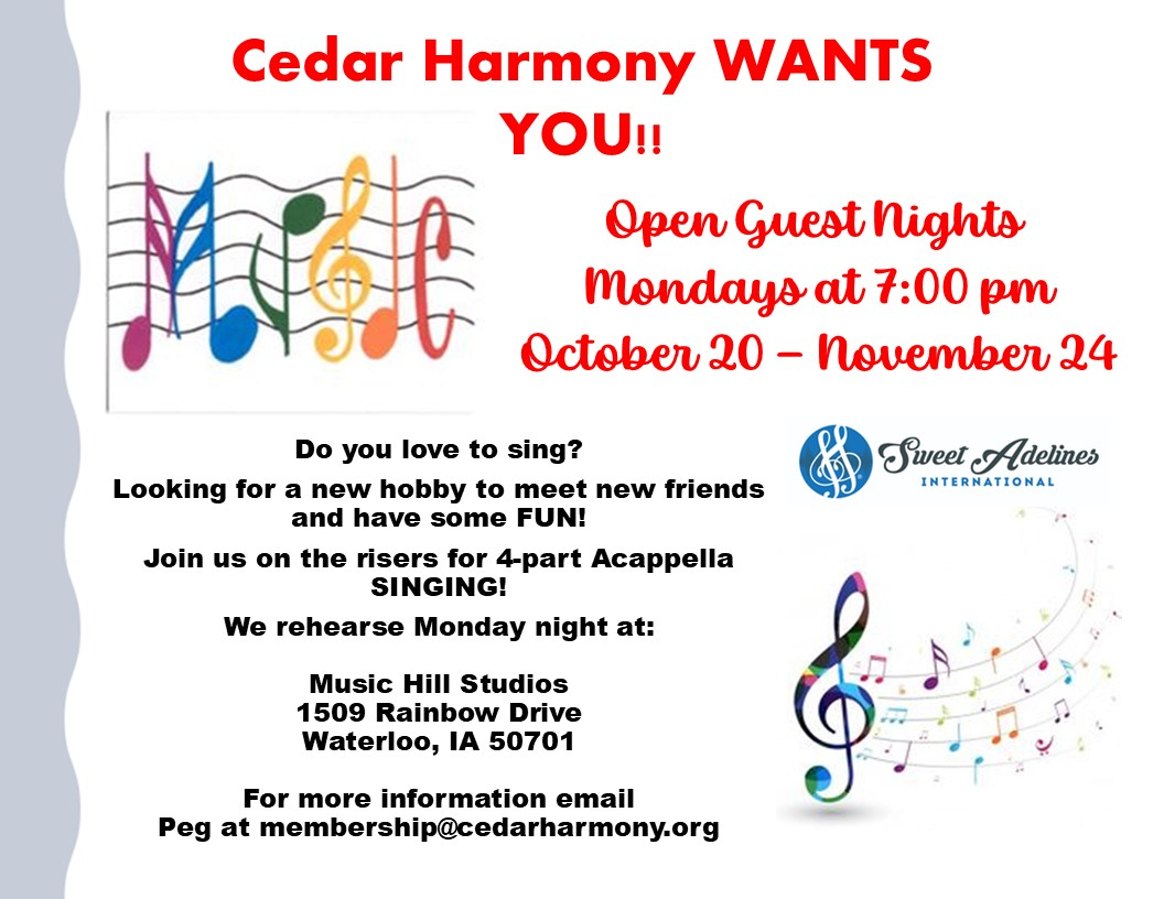 Join us any Monday night! Guests are welcome at all Cedar Harmony Rehearsals! For more information email Peg at: